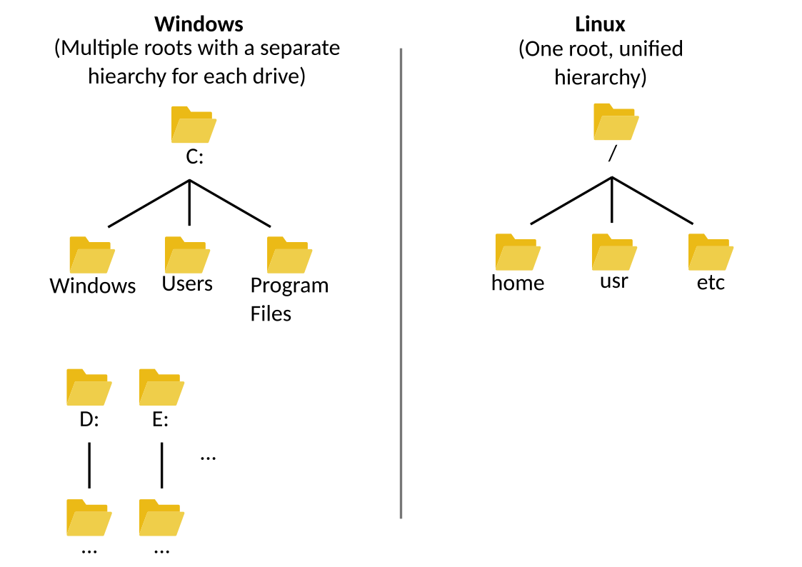 All major operating systems—Linux, Windows, and macOS—use hierarchical filesystems, but they differ in how the root and subdirectories are structured.