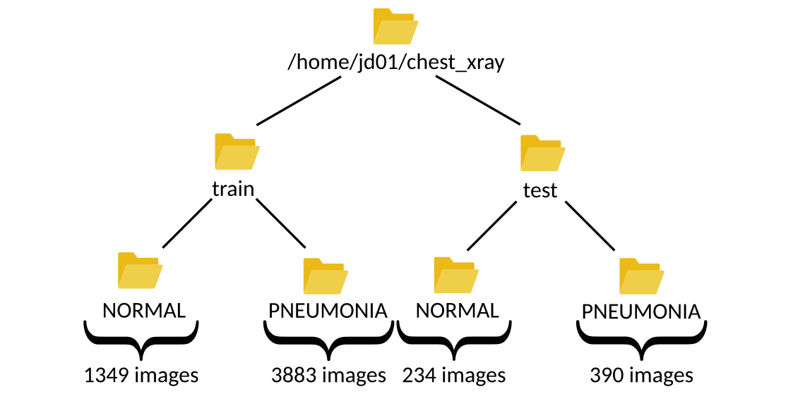 Assuming the user jd01 stores the dataset in /home/jd01/chest_xray, the directory structure will resemble the following: