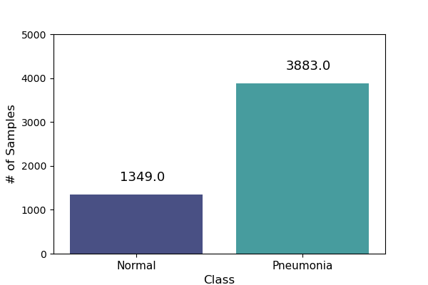 The train folder contains a total of 5,232 images—1,349 from healthy patients and 3,883 from patients diagnosed with pneumonia.